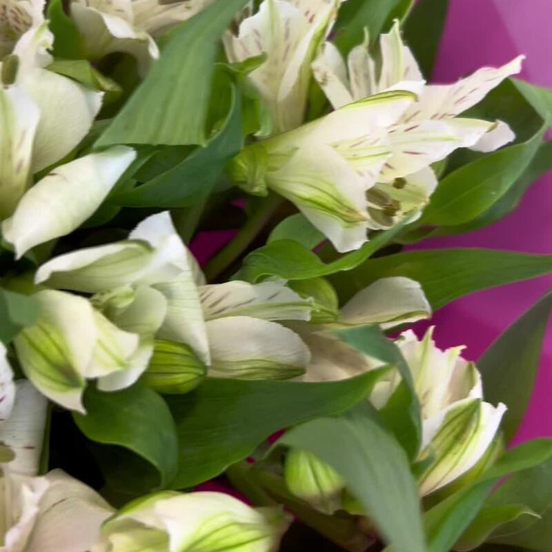 Лента атласная – 2 шт.Альстромерия – 11 шт.Упаковка дизайнерская – 2 шт.Зелень – 2 шт.