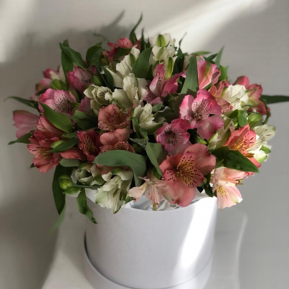 Композиция в коробке из стойких и красивых альстромерий