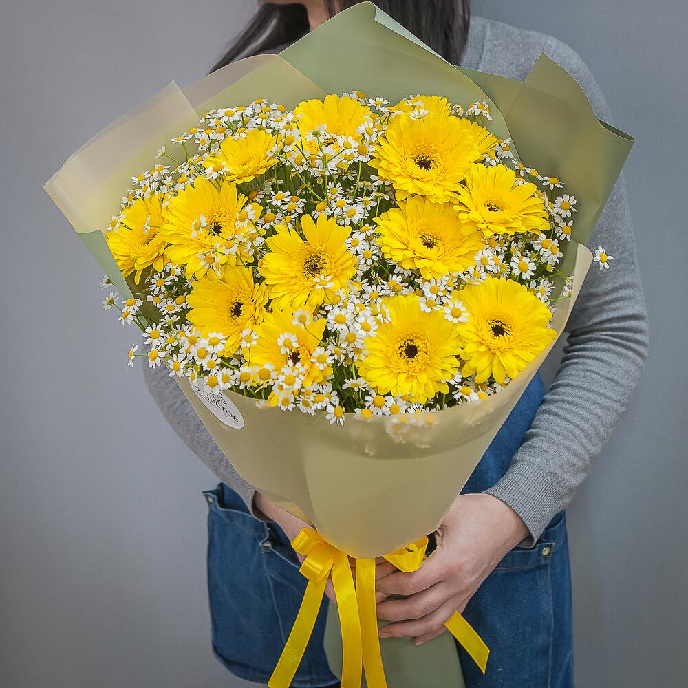 Букет из 15 желтых гербер и 20 ромашек кустовых