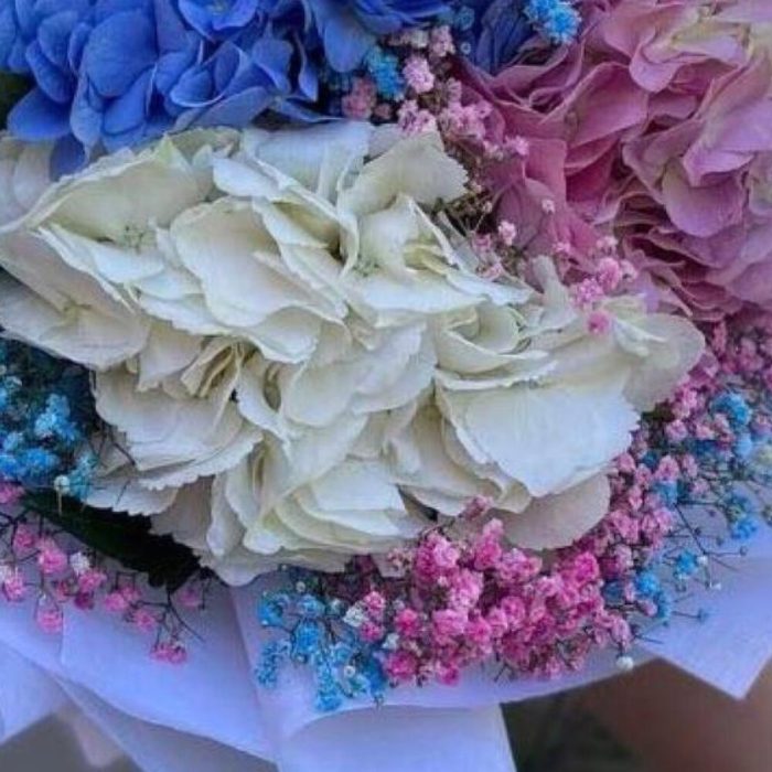 Гортензия розовая – 1 шт.гортензий голубая – 1 шт.Гортензия белая – 1 шт.гипсофила радужная – 12 шт.Упаковка дизайнерская – 1 шт.Лента атласная – 2 шт.Открыточка с вашими пожеланиями – 1 шт.хорошее настроение – 100 шт.инструкция по уходу за цветами – 1 шт.коробка переноска – 1 шт.Кризал – 1 шт.