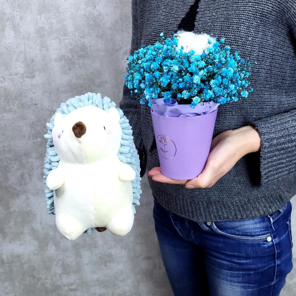 Голубой мини ёжик со стаканчиком гипсофилы