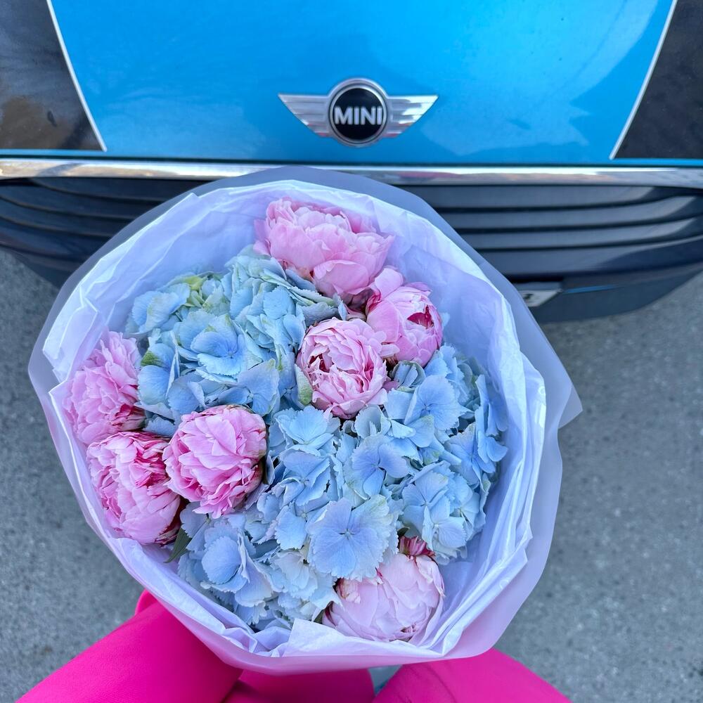 Гортензия – 2 шт.Пион – 7 шт.Лента атласная – 1 шт.Упаковка дизайнерская – 1 шт.Открыточка с вашими пожеланиями – 1 шт.