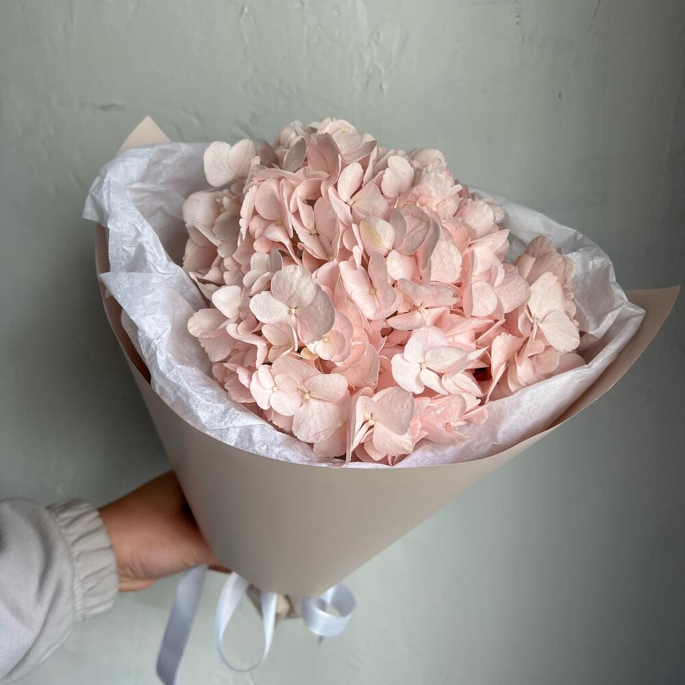 Лента атласная – 1 шт.Упаковка дизайнерская – 2 шт.Розовая гортензия – 1 шт.