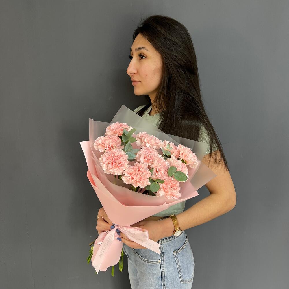 11 нежно-розовых диантусов с эвкалиптом