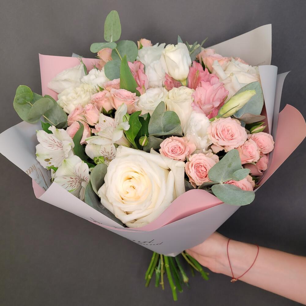 роза канделайт – 3 шт.Роза Мондиаль – 2 шт.Диантус – 4 шт.Альстромерия – 4 шт.Роза кустовая – 3 шт.эвкалипт ветка большая – 2 шт.Упаковка дизайнерская – 2 шт.