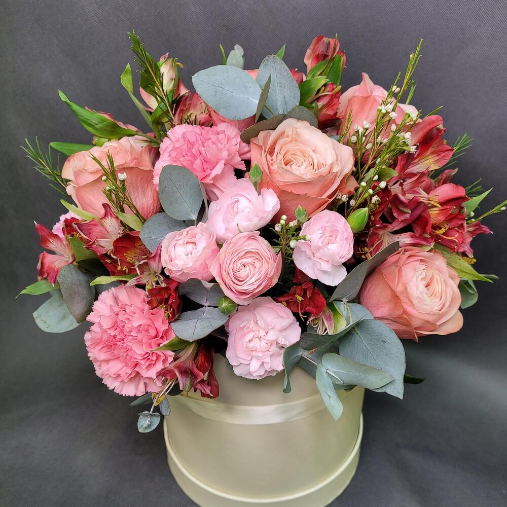 Роза Эквадор – 5 шт.Роза кустовая пионовидная – 2 шт.Диантус – 5 шт.Альстромерия – 3 шт.Диантус кустовой – 3 шт.зелень декоративная – 5 шт.Шляпная коробка – 1 шт.Оазис флористический – 1 шт.