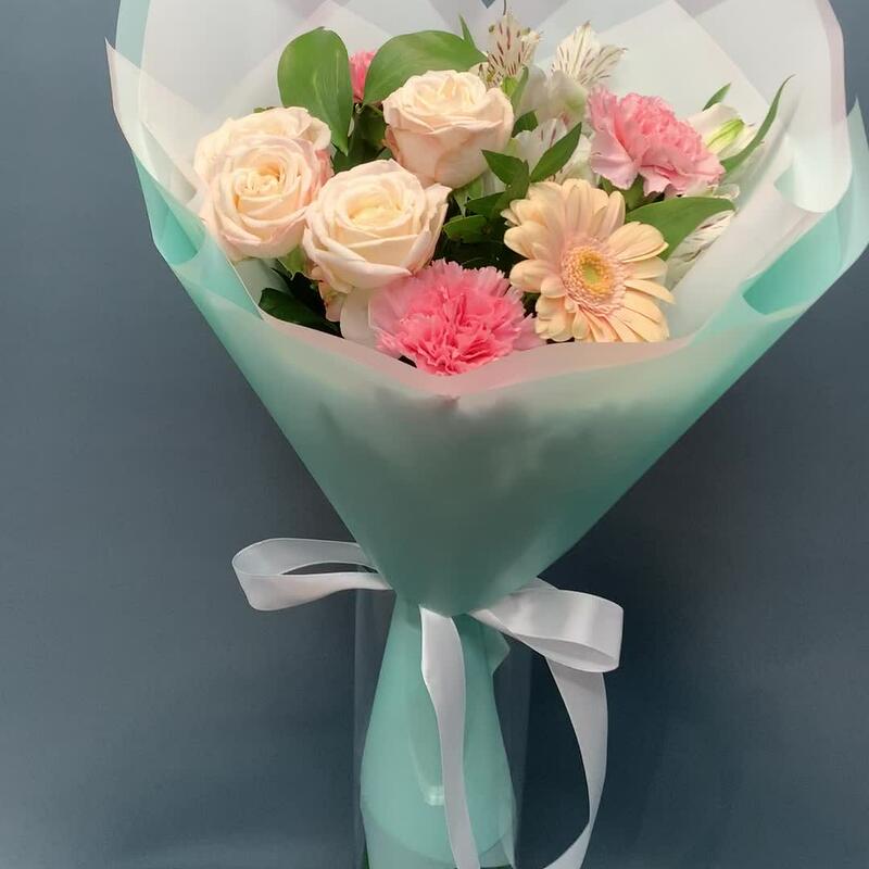 Альстромерия – 1 шт.Гермини – 1 шт.Салал – 1 шт.Диантус – 3 шт.Роза пионовидная кустовая – 1 шт.Фисташка – 3 шт.
