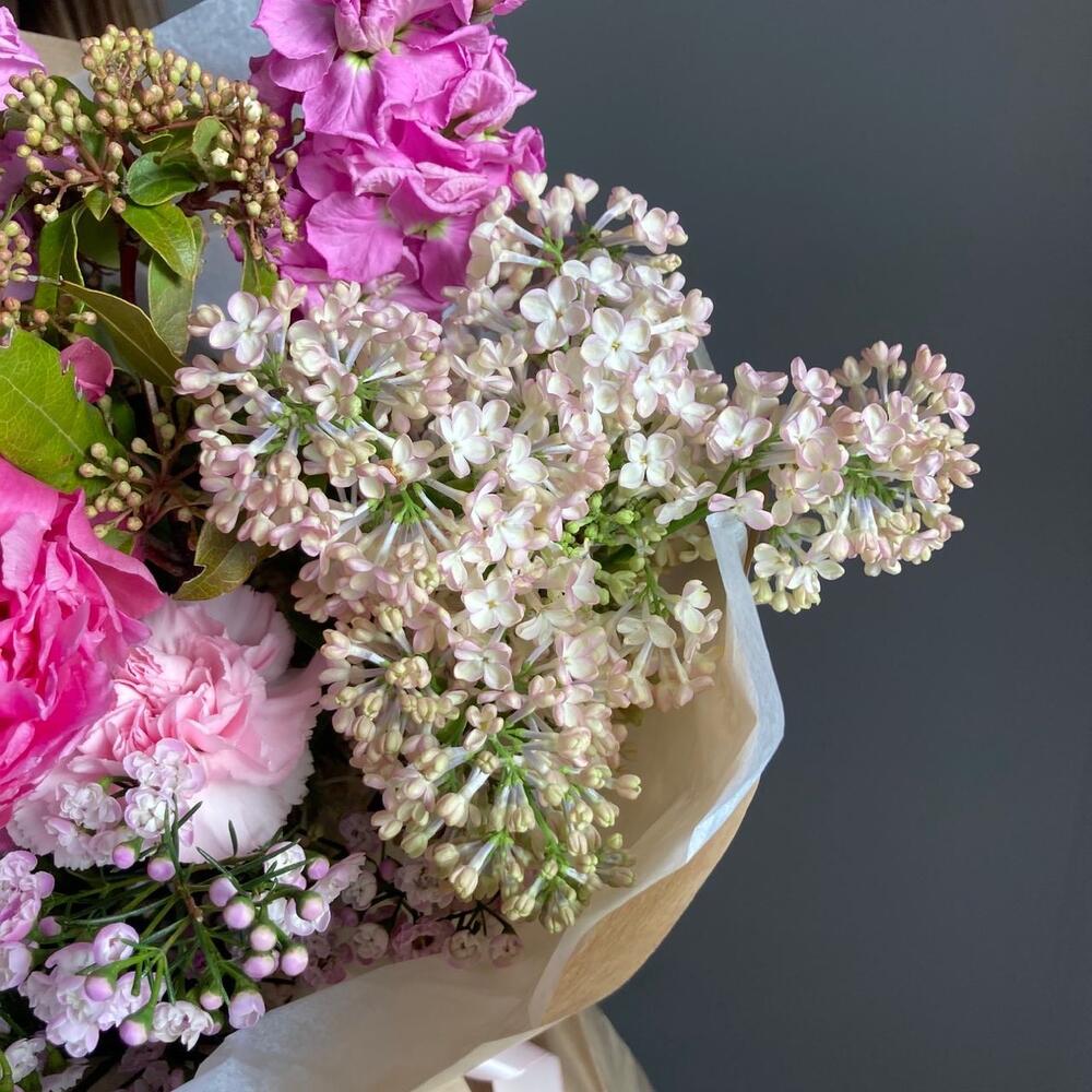 Авторский букет с сиренью, пионами, сортовыми хризантемами, маттиолой, восковым миртом, гвоздиками и вибурнумом.