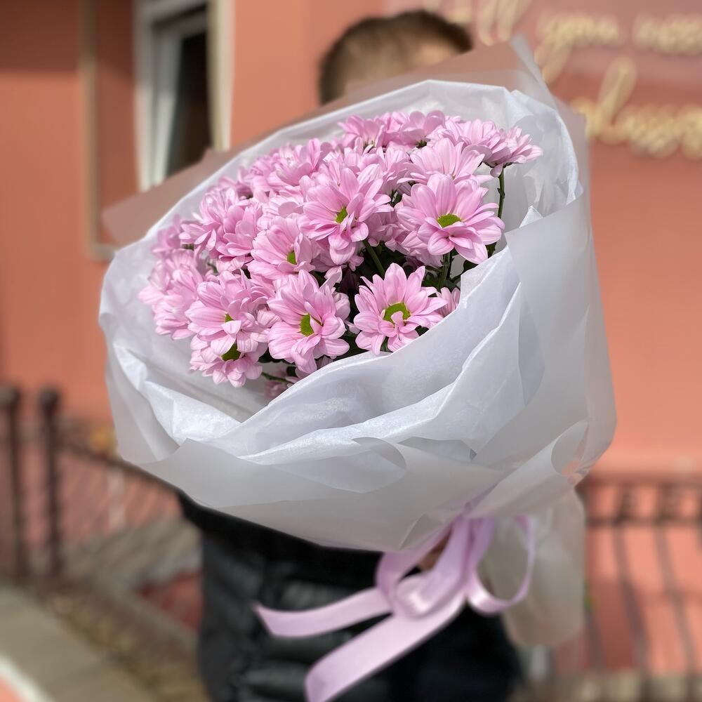 Лента атласная – 1 шт. Тишью – 1 шт. Ромашковая хризантема – 5 шт. Дизайнерская упаковка – 1 шт.