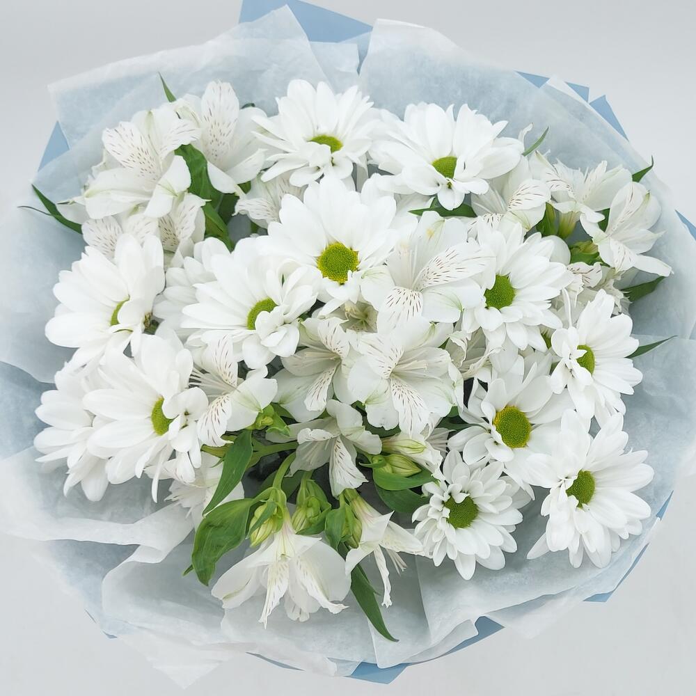 Стойкий букет из ромашковых хризантем и альстромерий. Такой букет всегда уместен и подойдёт для любого повода: День Рождения, именины, годовщина свадьбы, рождение ребенка, 8 марта, День Святого Валентина, выпускной и т.д. Можно вручить маме, сестре, подруге, коллеге, учителю, любимой.