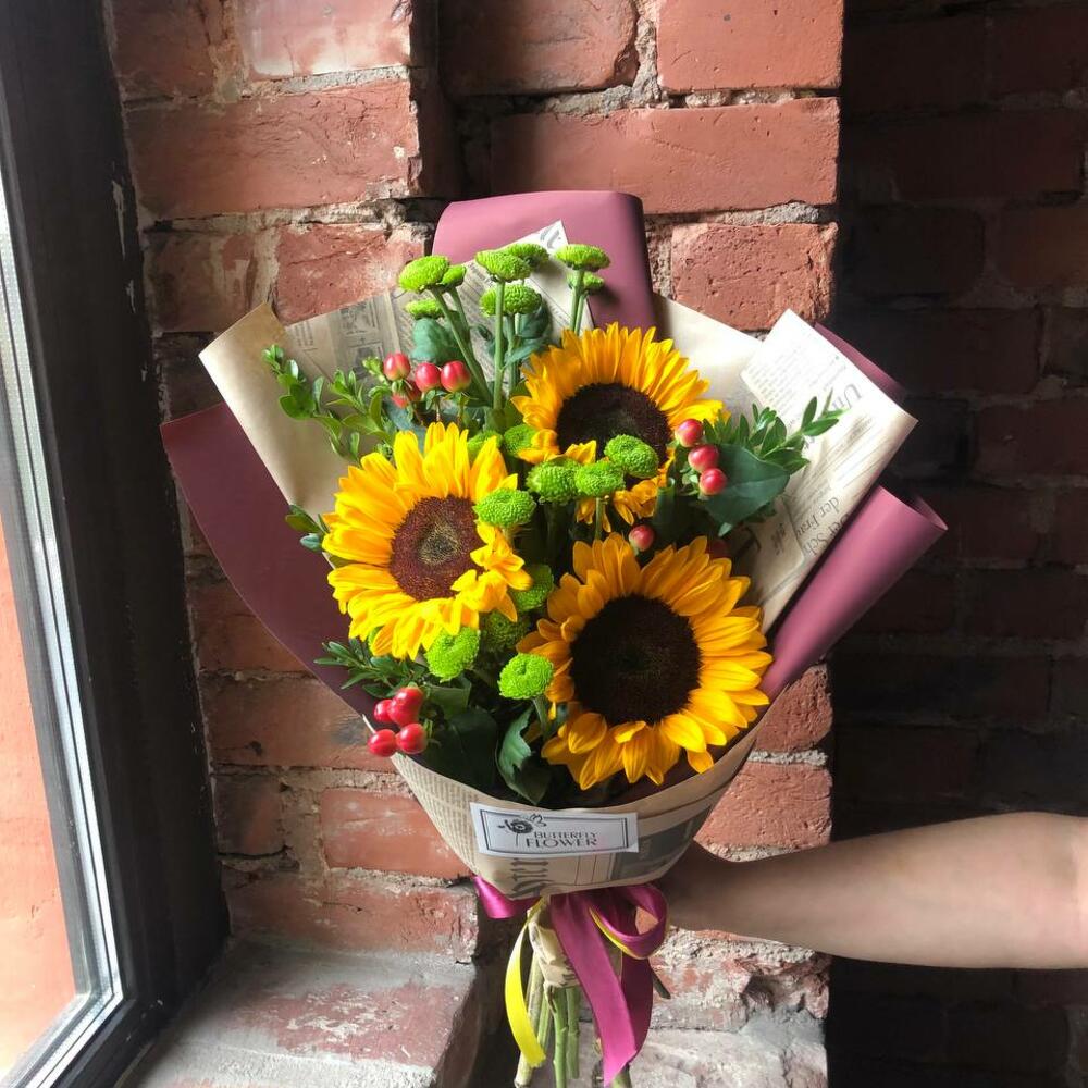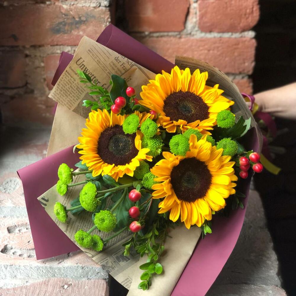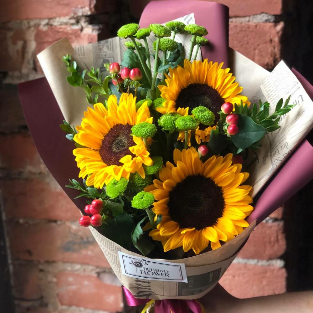 Букет из подсолнухов, гиперикума, кустовых хризантем и самшита в стильной упаковке “Осенние радости”