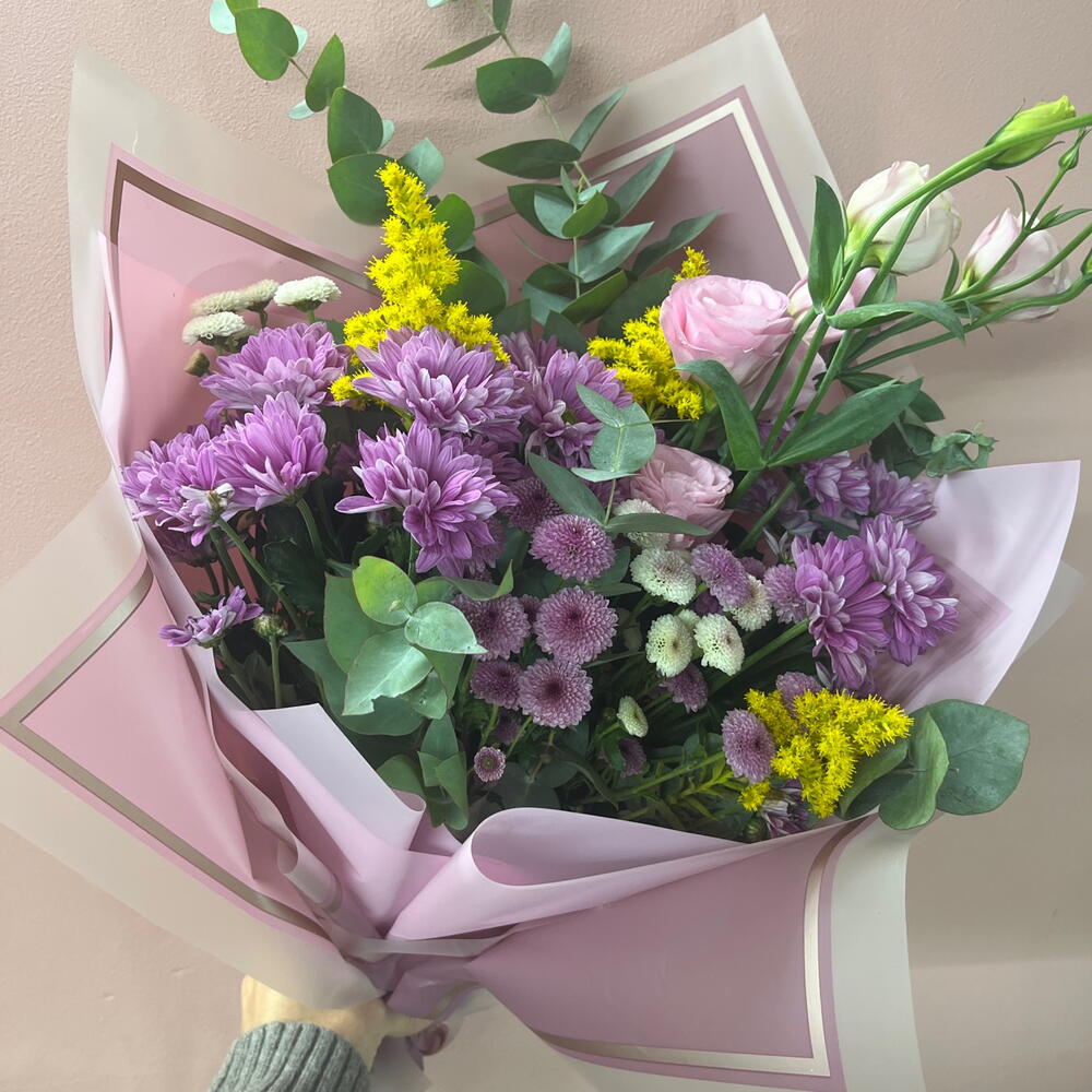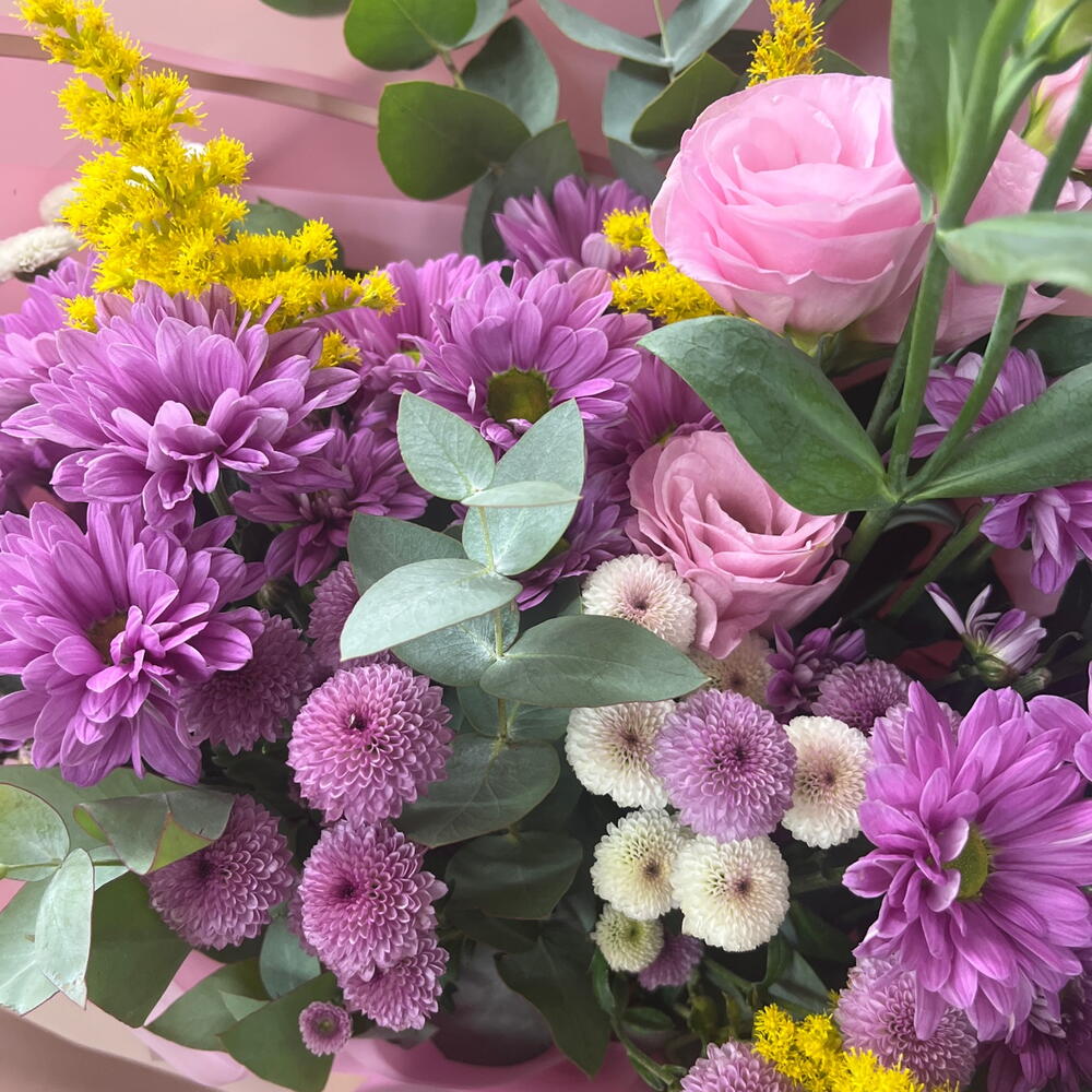 Альстромерии, Гвоздики, Кустовые розы, Лизиантусы, Розы, Хризантемы