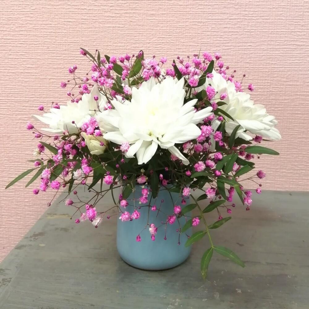 Композиция из хризантемы и гипсофилы в керамическом кашпо
