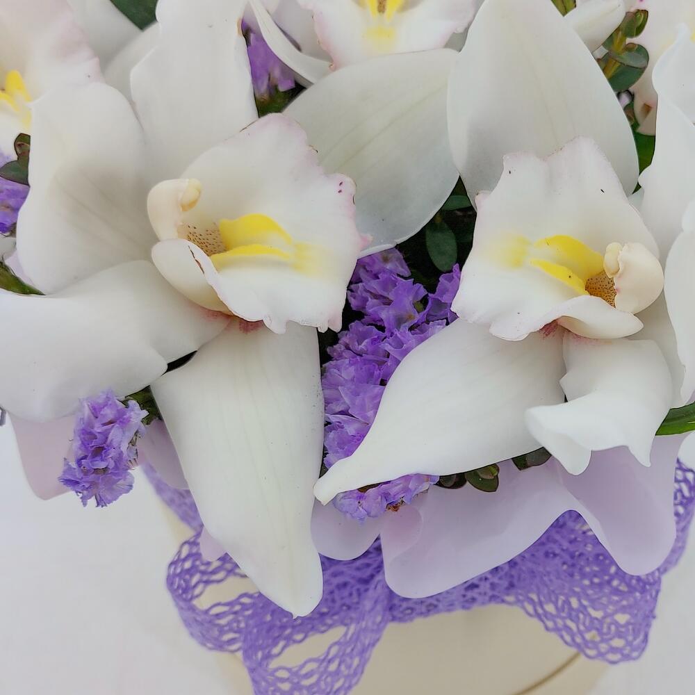 Орхидея цимбидиум бутон – 7 шт.Статица – 3 шт.Зелень – 3 шт.Пленка матовая – 1 шт.Лента Кружево – 1 шт.Флористическая губка (оазис) – 1 шт.