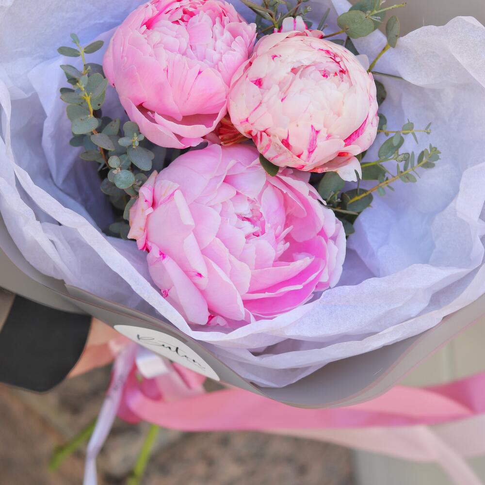 Букет-комплимент из розовых пионов с эвкалиптом