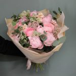 Пион – 5 шт.Маттиола – 4 шт.Озотамнус – 3 шт.Астранция – 3 шт.Эвкалипт – 7 шт.Фисташка – 3 шт.Бумага – 2 шт.Тишью – 3 шт.Лента атласная – 2 шт.Ранункулюс – 5 шт.