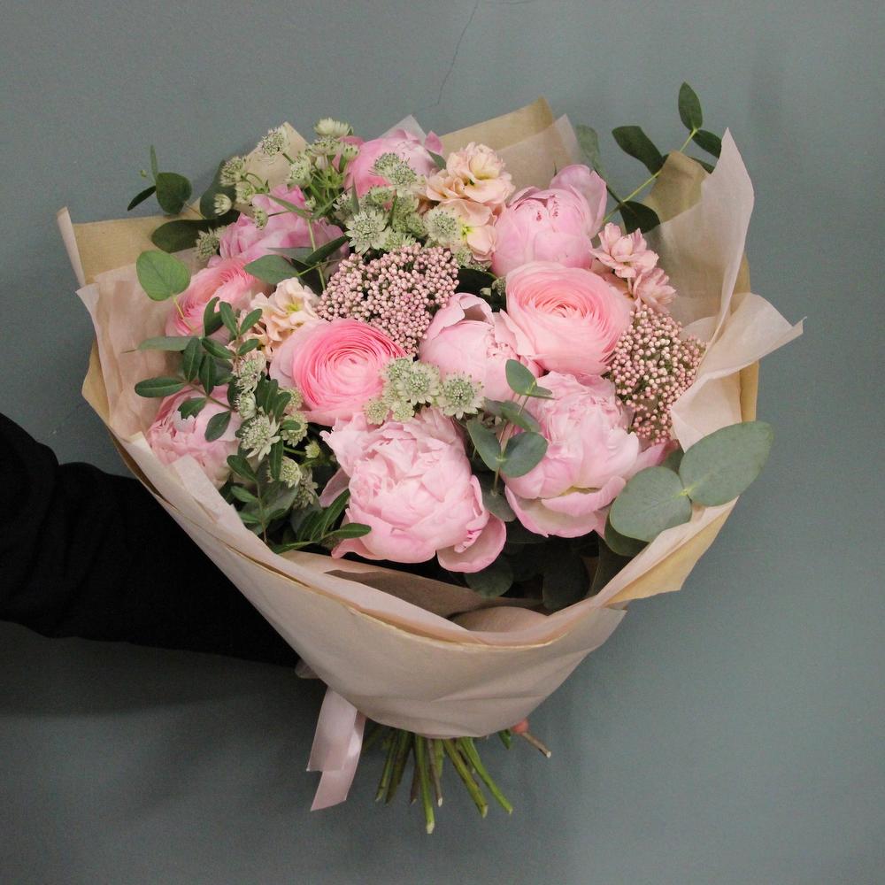 Букет из пионов и ранункулюсов, маттиолы и астранции, эвкалипта и озотамнуса.Стильное цветочное решение для любого случая.