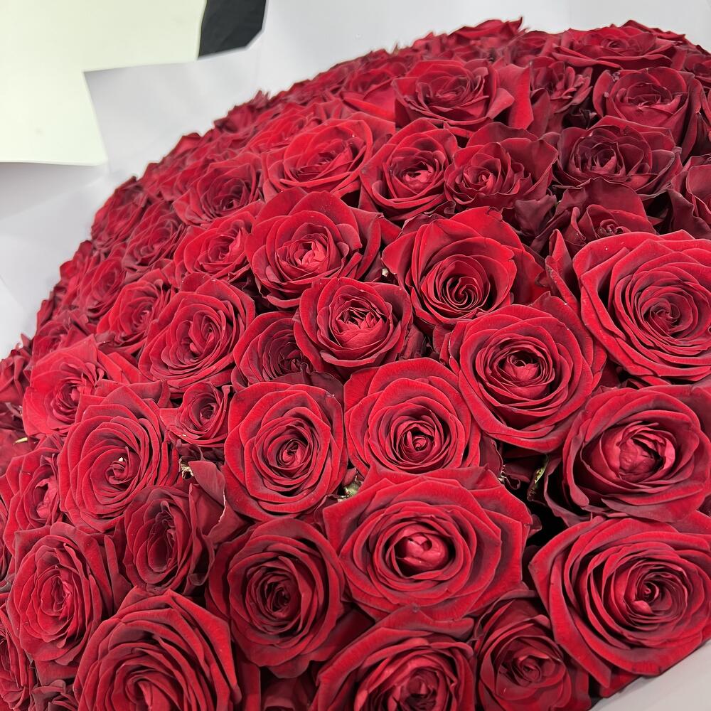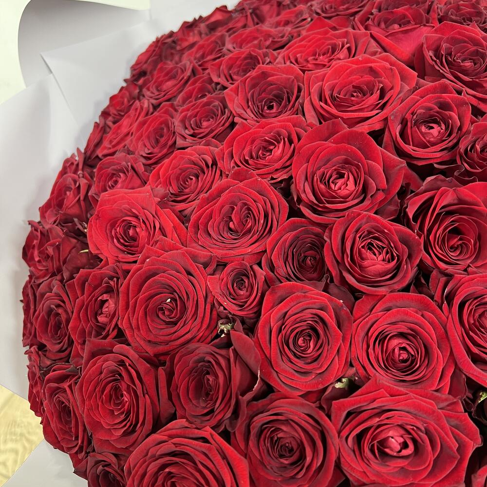Роза красная – 101 шт.Дизайнерская упаковка – 7 шт.Атласная лента – 1 шт.