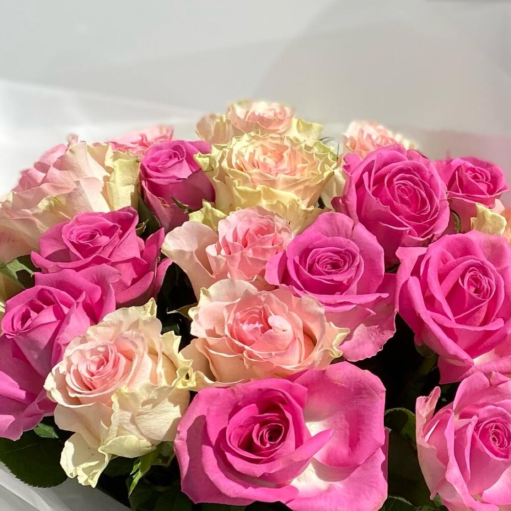 Роза Кенийская – 21 шт.Тишью – 2 шт.Упаковка дизайнерская – 4 шт.Лента атласная – 2 шт.