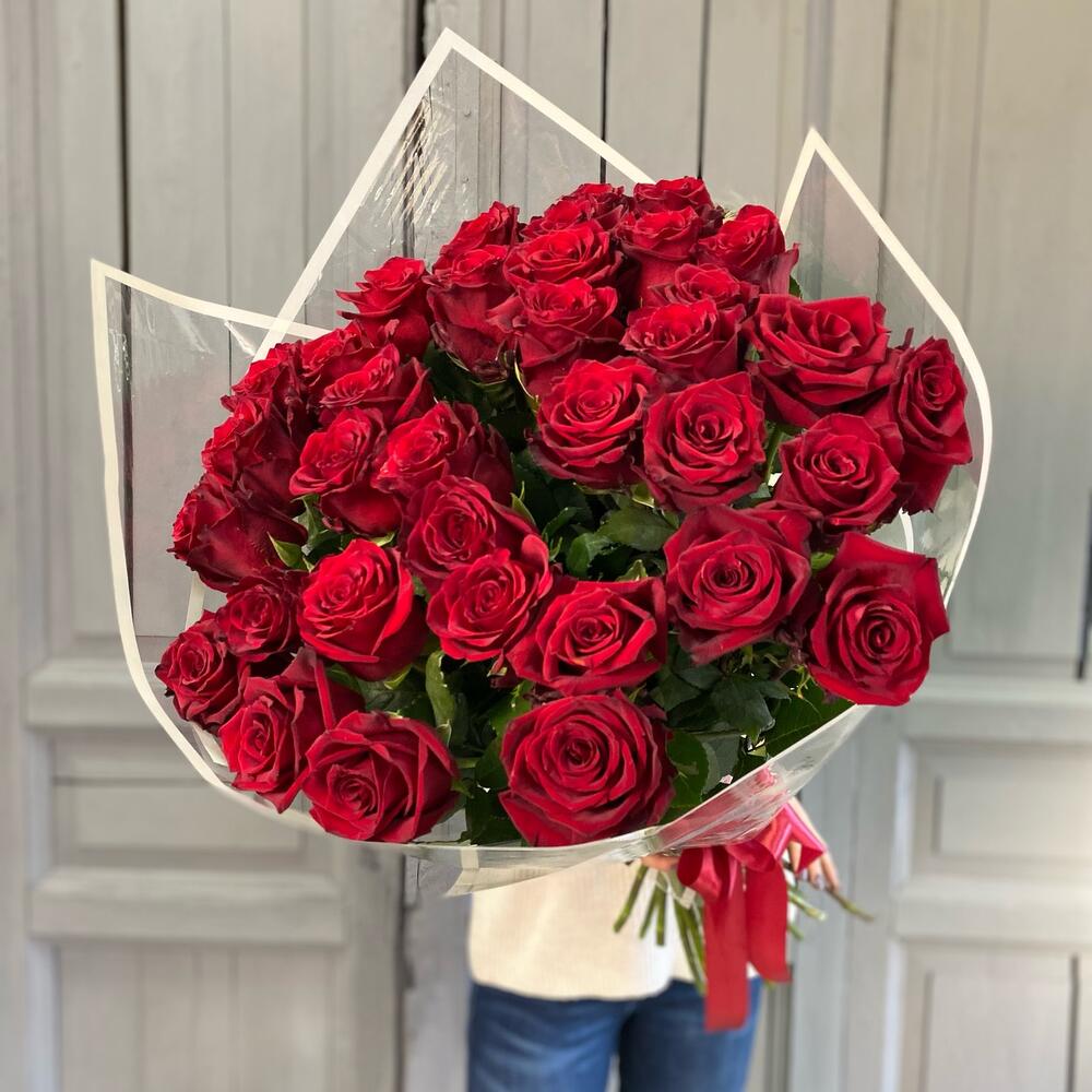 Роза Эквадор 70 см – 35 шт.Упаковка дизайнерская – 4 шт.Лента атласная – 1 шт.