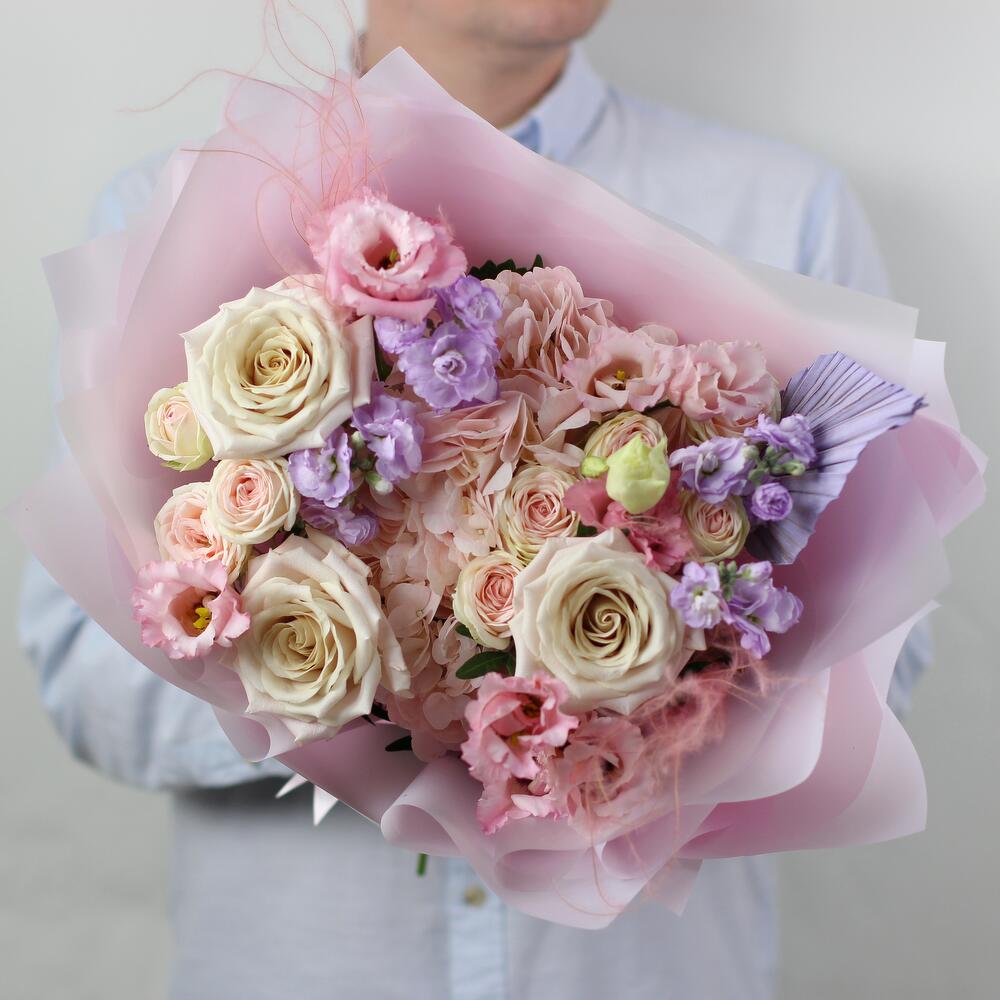 Гортензия – 1 шт.Маттиола – 3 шт.Писташ – 4 шт.Лента атласная – 1 шт.Роза кустовая пионовидная – 2 шт.Упаковка дизайнерская – 4 шт.эустома розовая – 3 шт.Стифа – 2 шт.Роза мента 50 см – 3 шт.пика пальма – 1 шт.