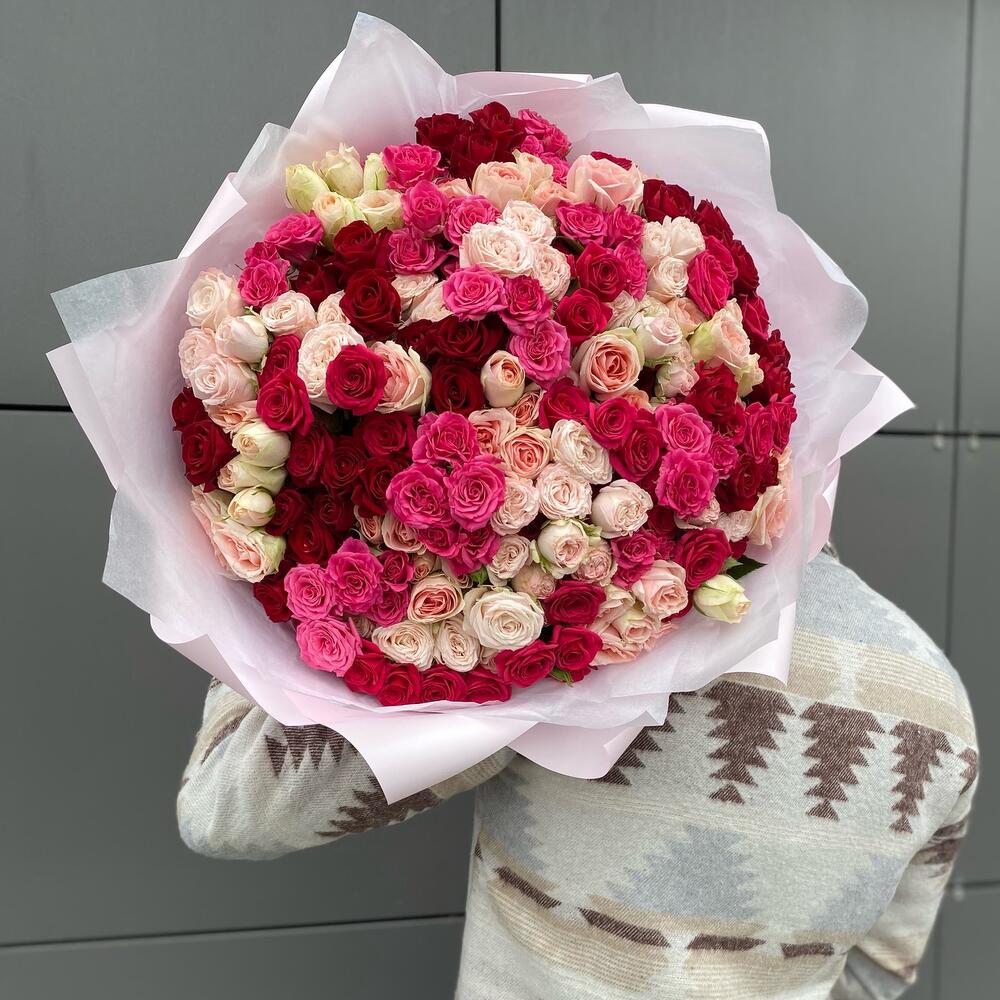Букет из 41 ветки кустовых роз разных сортов . Количество бутонов(роз) в букете может достигать 281 штуку.