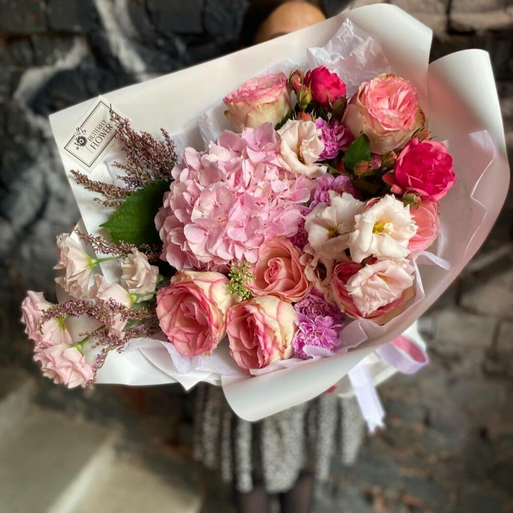 Гортензия – 1 шт.Роза – 8 шт.Эустома – 3 шт.Вереск – 2 шт.Гвоздика – 7 шт.Роза пионовидная кустовая – 2 шт.Седум – 2 шт.Упаковка – 2 шт.