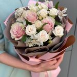 кустовая роза порцелина – 3 шт. Альстромерия – 2 шт. Роза пинк мондиаль – 3 шт. Озотамнус – 1 шт. Оформление – 1 шт.