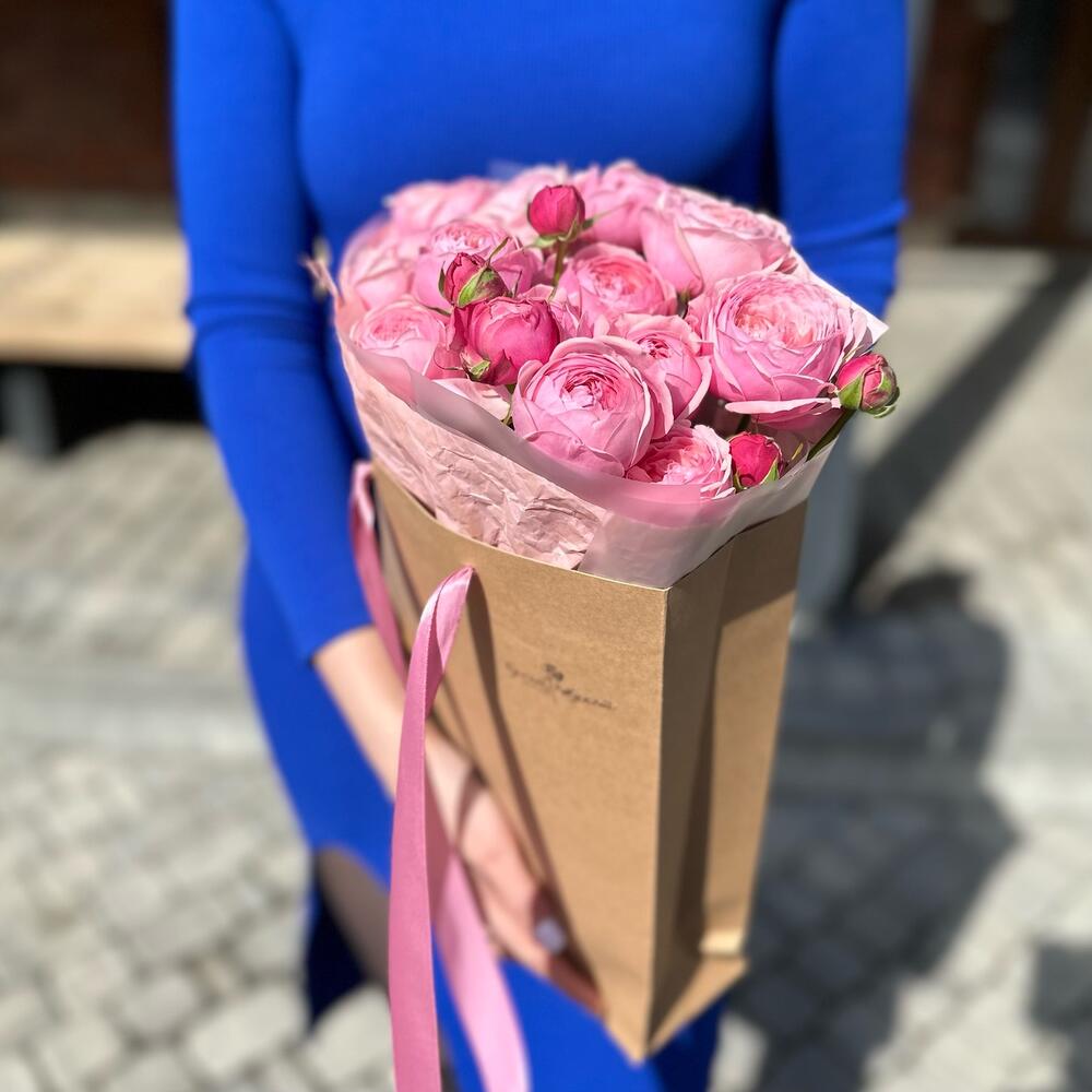 Лента атласная – 1 шт.Роза пионовидная кустовая – 5 шт.Пленка матовая – 1 шт.Крафт жатый – 1 шт.Пакет крафтовый – 1 шт.