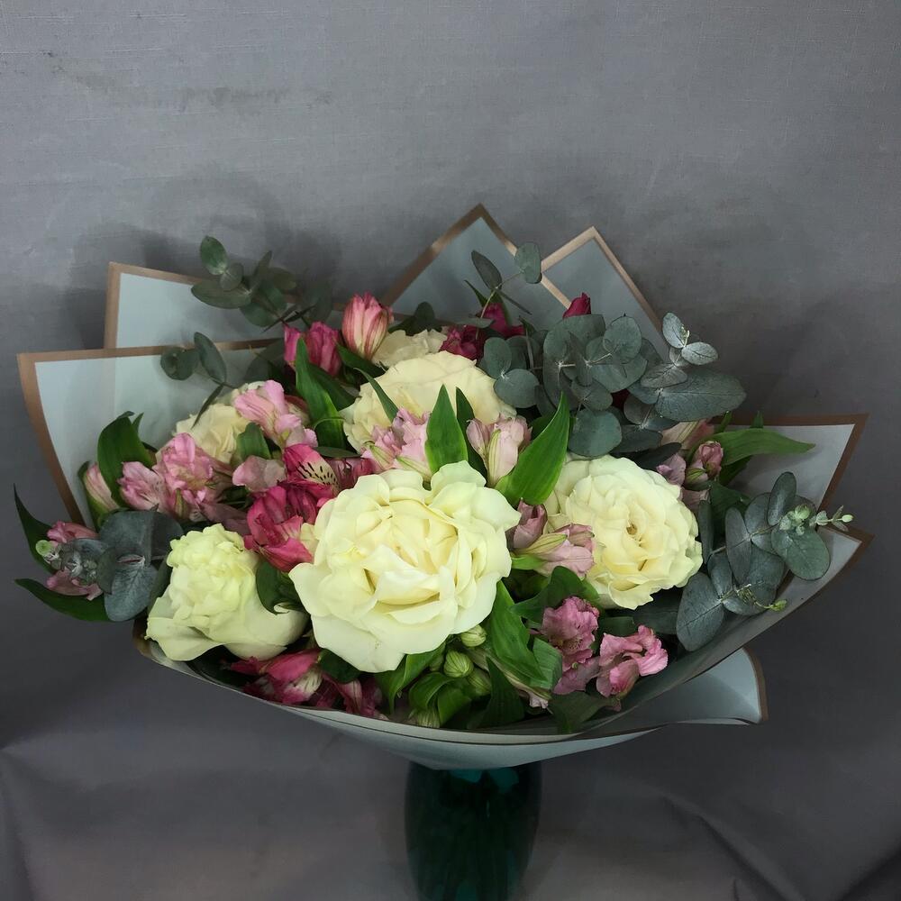 Роза – 7 шт.Альстромерия – 10 шт.Эвкалипт – 4 шт.Дизайнерская упаковка – 2 шт.