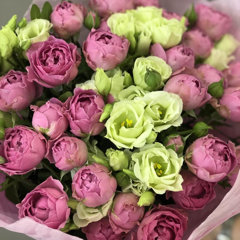 Эустома – 5 шт. Упаковка дизайнерская – 1 шт. Роза misty bubbles – 7 шт.