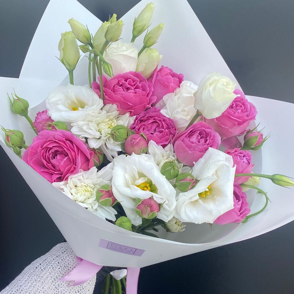 Упаковка дизайнерская – 1 шт. Открыточка с вашими пожеланиями – 1 шт. эустома белая – 3 шт. Misty Bubbles пионовидная роза – 5 шт.