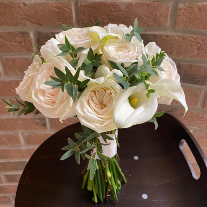 Эвкалипт – 2 шт.Лента атласная – 1 шт.Гвоздика белая – 3 шт.Фрезия белая – 7 шт.Калла белая – 7 шт.Роза пионовидная белая – 9 шт.Булавка с бусами – 4 шт.