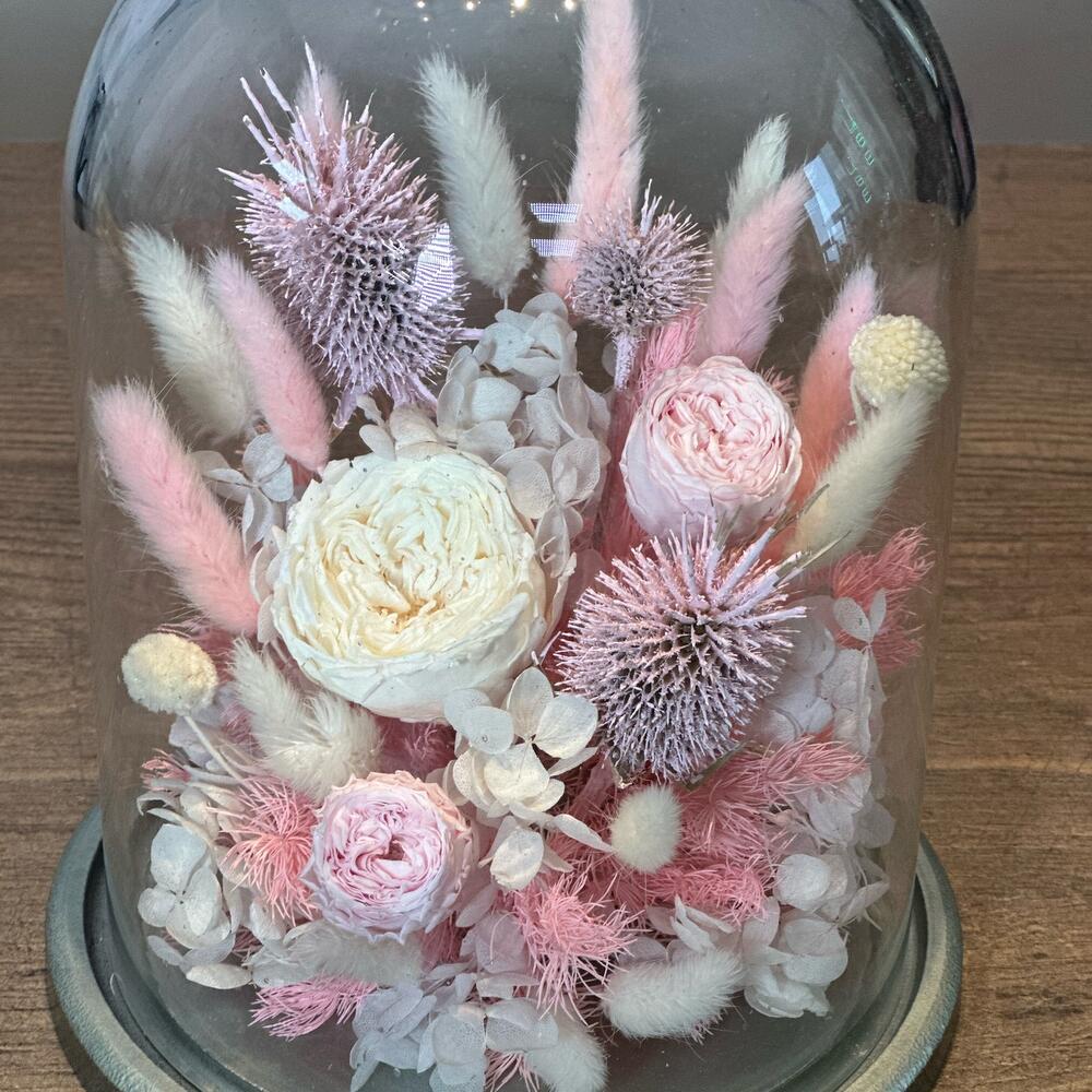 Клош из стекла – 1 шт.Роза стабилизированная – 3 шт.краспедия стабилизированная – 2 шт.гортензия стабилизированная – 2 шт.эрингиум сухоцвет – 3 шт.Лагурус (сухоцвет) – 20 шт.