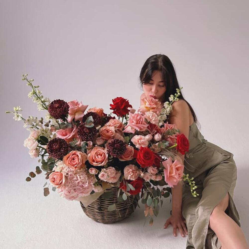 Роза пионовидная – 15 шт.Хризантема – 7 шт.Роза кустовая – 7 шт.Дельфиниум – 4 шт.Роза – 10 шт.Эвкалипт – 10 шт.Гортензия – 1 шт.Гвоздика – 11 шт.