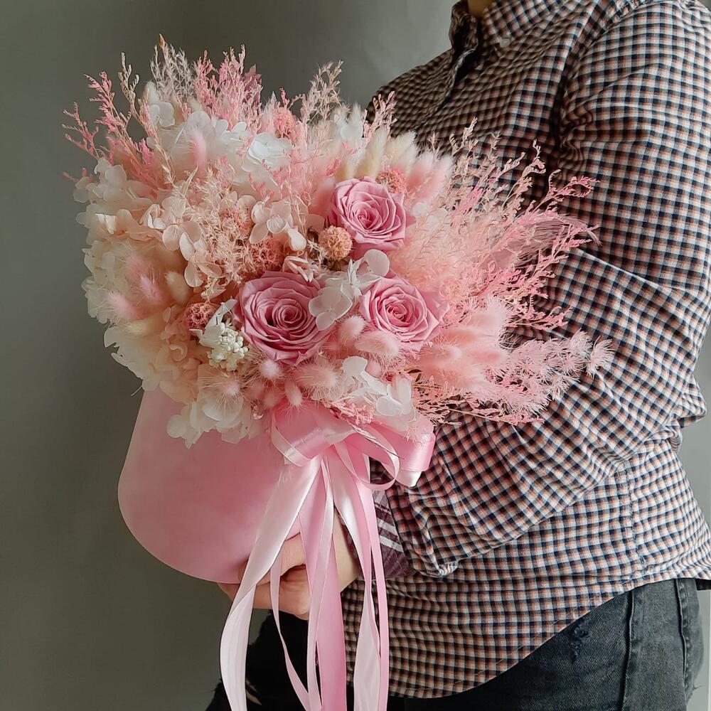 Роза стабилизированная – 3 шт.гортензия стабилизированная – 2 шт.лагурус (сухоцвет)пучок – 2 шт.Лимониум – 2 шт.аспарагус стабилизированный – 2 шт.папоротник стабилизированный – 3 шт.ветки декоративные – 15 шт.Оазис для сухоцветов – 1 шт.Коробка шляпная бархатная – 1 шт.Лента атласная – 3 шт.перо декоративное – 2 шт.