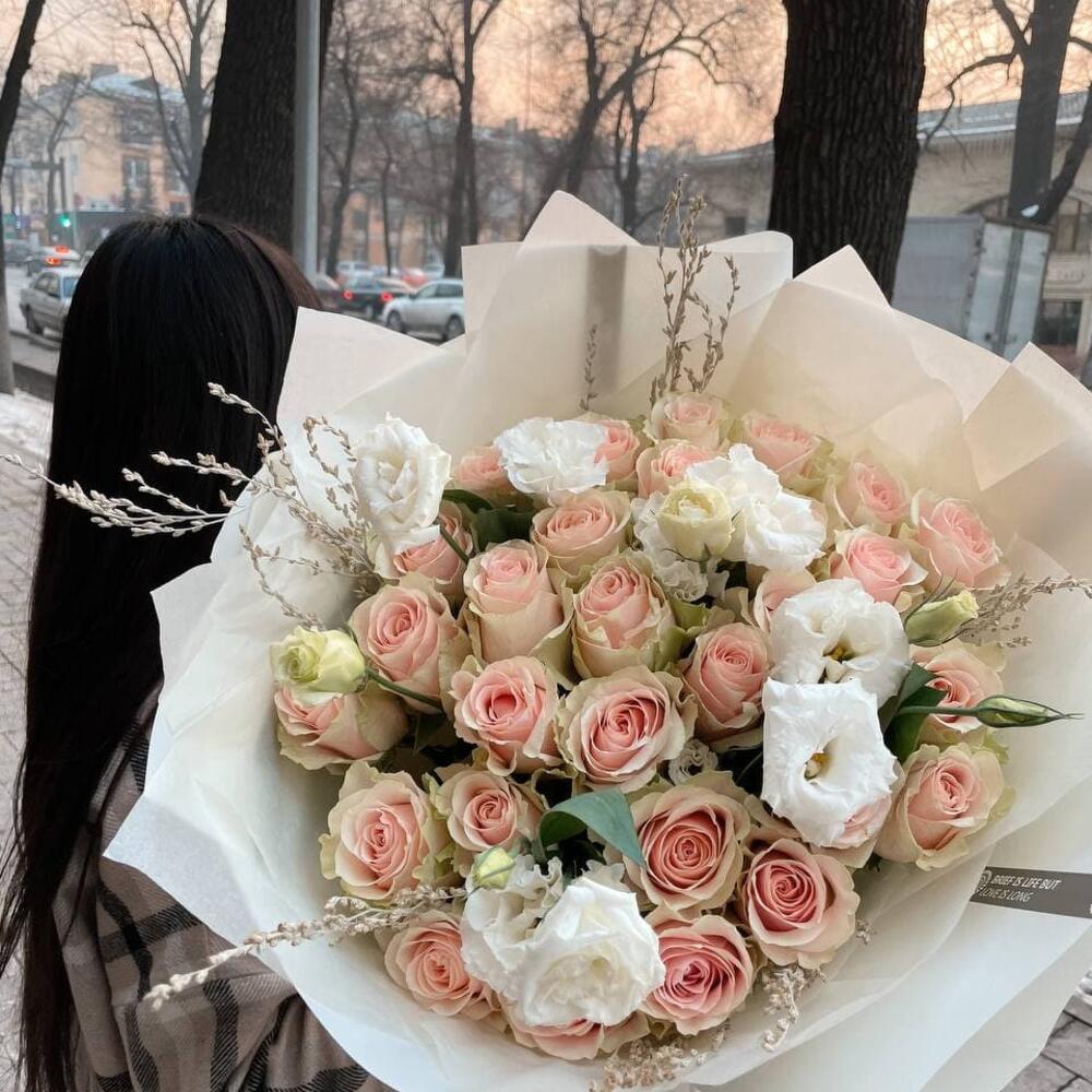 Гвоздики, Лизиантусы, Розы, Тюльпаны