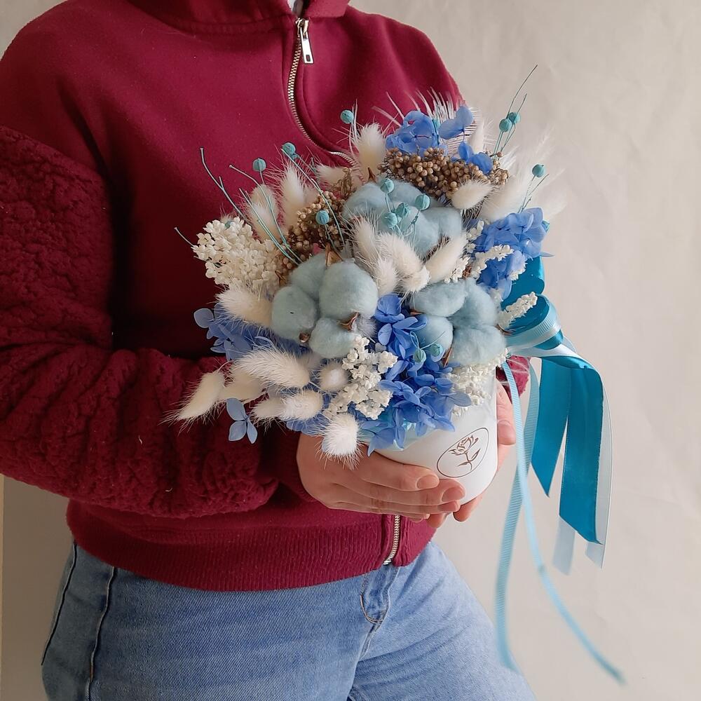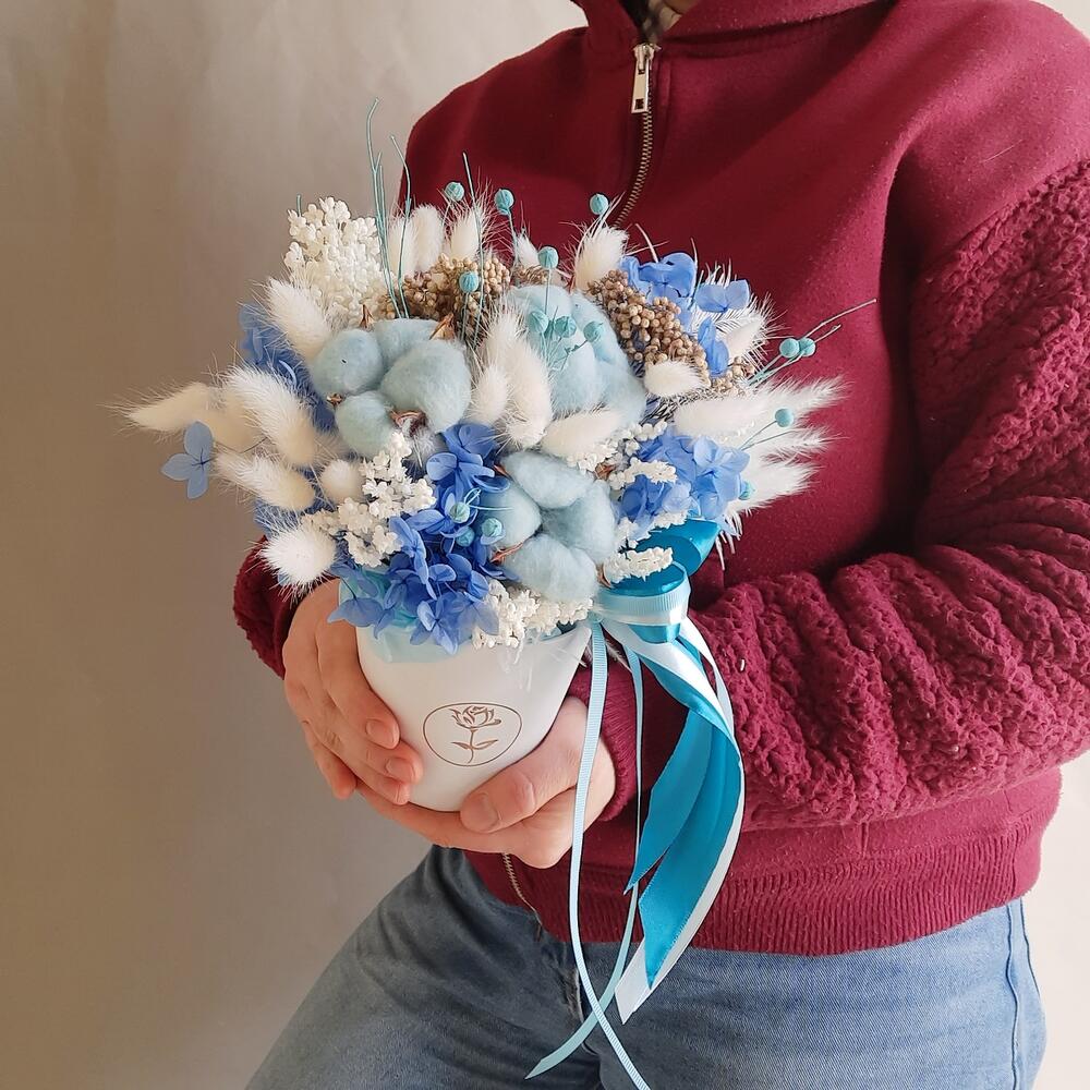 Хлопок натуральный – 3 шт.гортензия стабилизированная – 1 шт.лагурус пучок – 1 шт.перо декоративное – 1 шт.лен натуральный пучок – 1 шт.камыш декоративный – 1 шт.Озотамнус – 2 шт.ветки декоративные – 25 шт.Оазис для сухоцветов – 1 шт.Кашпо картонное – 1 шт.Лента атласная – 3 шт.